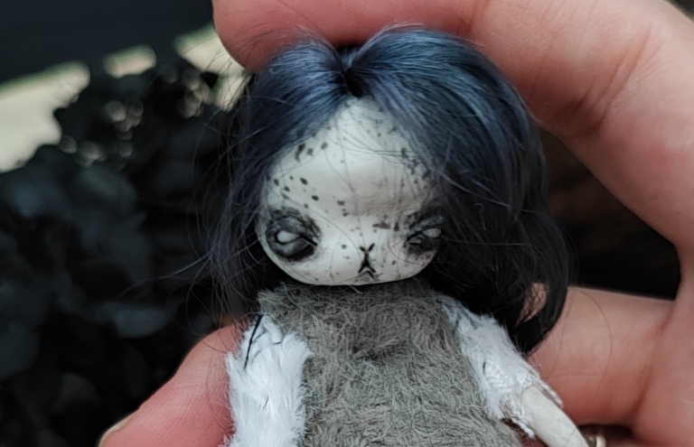 ヘッドを樹脂粘土、手足をダークなキャラクターにあわせて粘土やミクストメディアで創作します。基本的に、関節を持たない布人形の構造をしています。